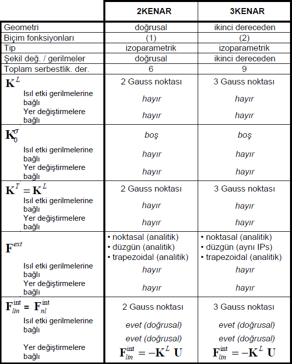 Bu elemanların her noktada üç serbestlik derecesine bulunmaktadır (global eksen bazlı üç yer değiştirme). Şekil değiştirme/yer değiştirme tensörleri her tümleştirme noktasında tanımlanır. Bunların hepsi yay doğrultusundaki tek bir değere indirgenir.