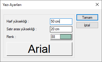 Yazı ayarlarına Yazı ayarları komutundan ulaşılır. Proje tasarımına uygun yazı rengi, yüksekliği, tipi ve satır arası yüksekliği ayarlanır.