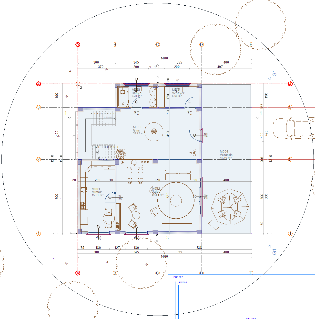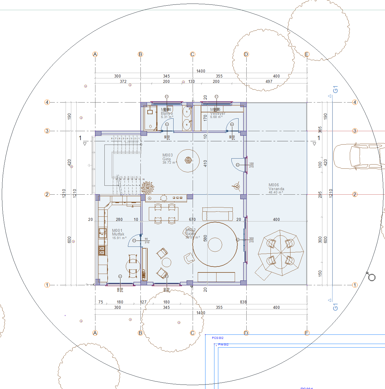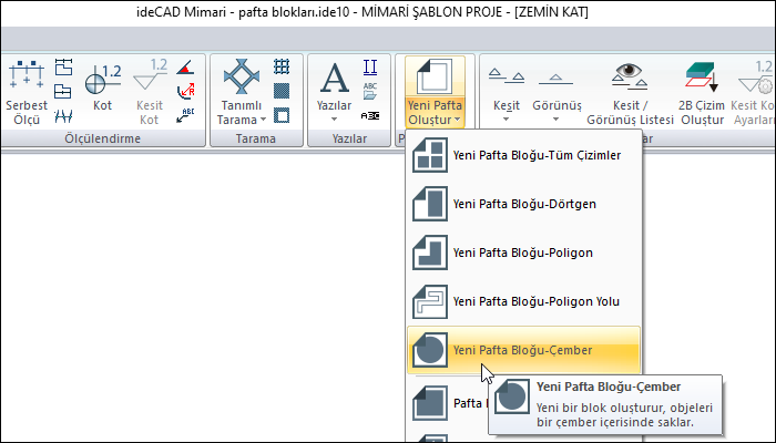 Yeni Pafta Bloğu-Çember komutu ile çalışılan çizim penceresinde, çizilen bir çemberin içinde kalan objeler kesilerek hafızaya ya da arşive kaydedilir.