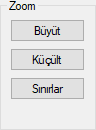 Zoom ![]() Büyüt ve Küçült butonları tasarım penceresindeki görüntüyü büyültüp küçültür. Sınırlar butonu, çizim sınırları içindeki alanı görüntüler. Zoom butonu tıklanıp imleç tasarım penceresi üzerine sürüklendiğinde, imlecin şeklinin değiştiği görülür. |
