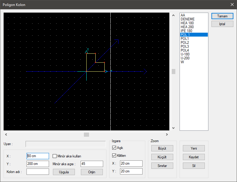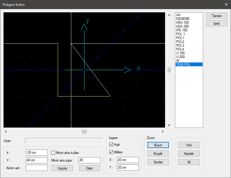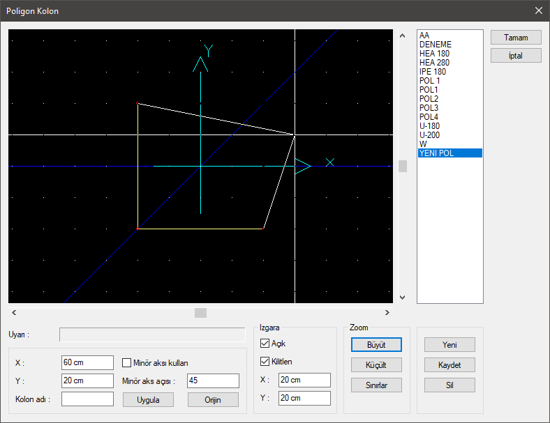 Tasarım penceresi ![]() Poligon kolonun görüntüsü izlenir. Düğüm noktaları tıklanarak poligon kolon üzerinde düzenlemeler yapılır. |