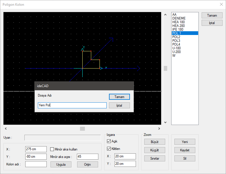 Tamam butonuna tıklayarak diyalogları kapayın. Çizim ekranına geldiğinizde poligon kolonunuzu yerleştirebilirsiniz.
