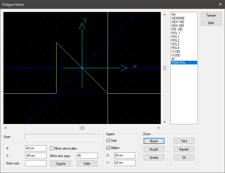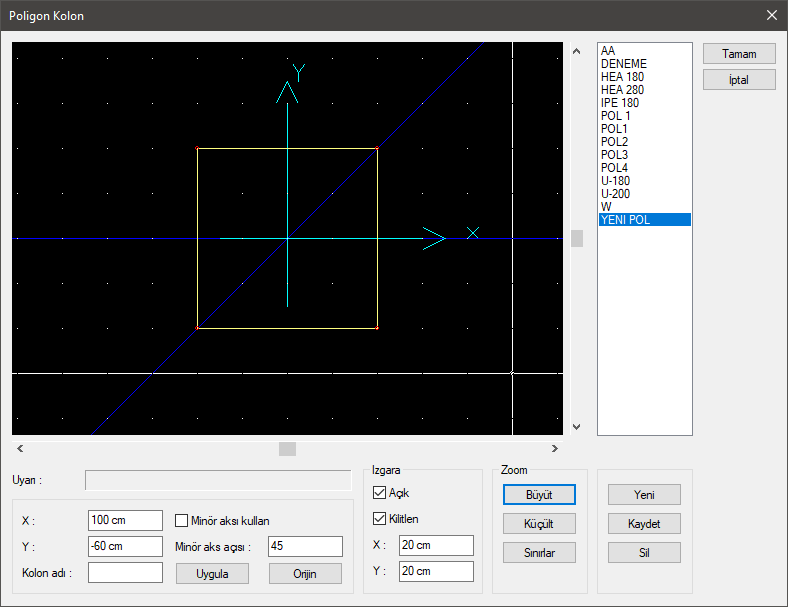 X/Y ![]() Poligon kolon köşe noktaları taşınırken, X ve Y kutucuklarından nokta koordinatı girilebilir. |