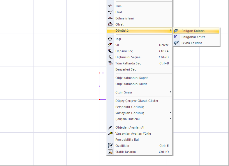 Poligon kolon çizmek için pratik yöntemlerden biri de poligon kolona dönüştür komutudur. Çizgiyle oluşturulmuş poligon kolon konturunu poligon kolona dönüştürür.