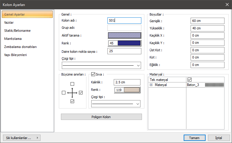 Kolon Ayarları diyaloğunda Poligon Kolon butonuna tıklayarak Poligon Kolon Diyaloğuna ulaşabilirsiniz.