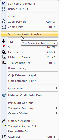 Obje seçiminden sonra farenin sağ tuşu tıklandığında açılan menüden Yeni Seçim Grubu Oluştur komutuna ulaşabilirsiniz.
