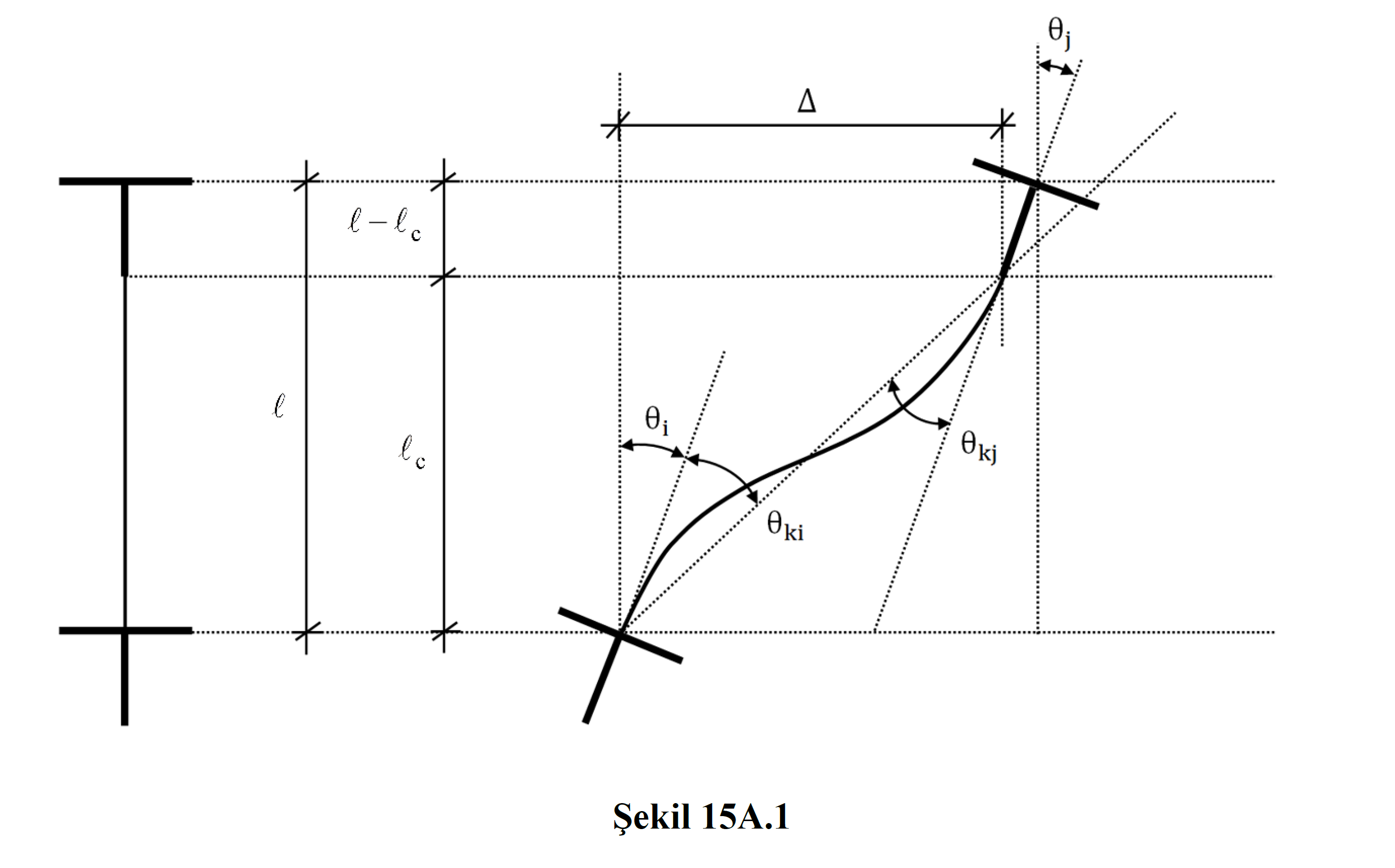 Bu denklemde Δ eleman uç düğüm noktaları arasındaki göreli ötelenmeyi temsil etmektedir. lc , eleman net açıklığıdır. θi değeri elemanın i düğüm noktasındaki düşey yükler ile Ra=1 olarak alınmış deprem yüklerinden (yükleme durumları) oluşan dönme değerini ifade eder. Bu durumda θki yalnızca doğrusal deprem hesabıyla yapılmış analiz sonuçlarından elde edilmektedir.