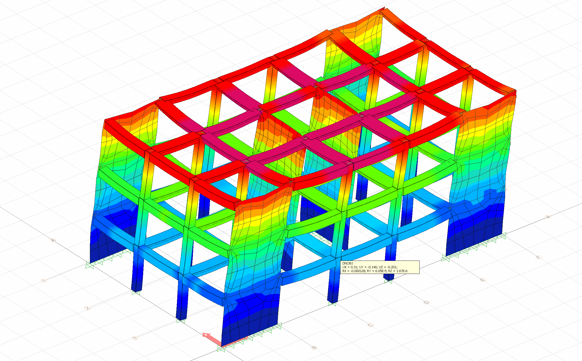 Yapı taşıyıcı sistem modeli üç boyutlu oluşturulduğundan eleman düğüm noktalarındaki göreli ötleme Δ değeri 'de üç boyutlu sistemde hesaplanır. Aşağıdaki resimde bir üç boyutlu bir analiz sisteminin herhangi bir eleman düğüm noktasındaki yerdeğiştirme sonuçları gösterilmiştir. Analiz sonuçlarında düşey yükler ile Ra=1 olarak alınmış deprem yüklerinden (yükleme durumları) oluşan düğüm noktası yerdeğiştirme değerleri kullanılır. Bu sonuçlar UX, UY ve UZ olmak üzere üç adet öteleme ile RX, RY ve RZ olmak üzere üç adet dönme değerleridir. Δ değeri hesaplanırken bütün kolon elemanlarının UX ve UY değerlerinin vektörel yerdeğiştirmeleri dikkate alınır. Benzer şekilde bir düğüm noktasının dönme değeri θki hesaplanırken RX ve RY dönme değerlerinin vektörel dönmeleri dikkate alınır.