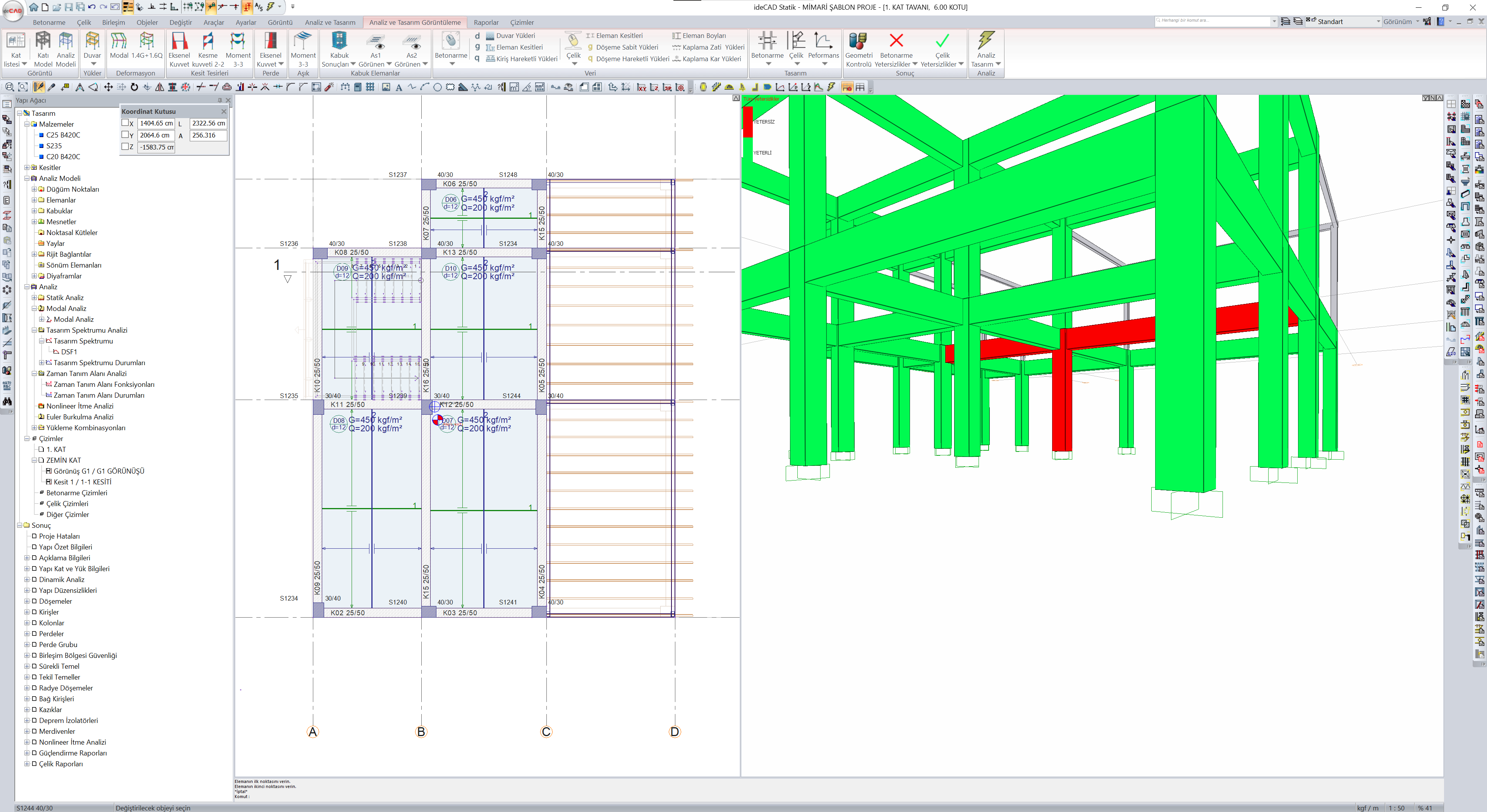 Görselleştirme Penceresinde betonarme elemanlar yeşil renkte gösterilecektir.