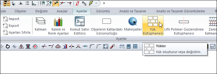 Yük kütüphanesi 'nde döşeme ve kiriş elemanları için, düzgün yayılı kaplama yükleri, sabit yükler, hareketli yükler, duvar yükleri katman mantığı ile tanımlanır. Yük değerleri, kütüphane olarak arşivleyip herhangi bir projede tekrar kullanılır.
