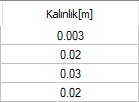 | Kalınlık  Seçilen döşeme yükünün katmanlarına ait kalınlıklar listelenir. |