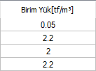 | Birim yük  Seçilen döşeme yükünün katmanlarına ait birim yükler listelenir. |