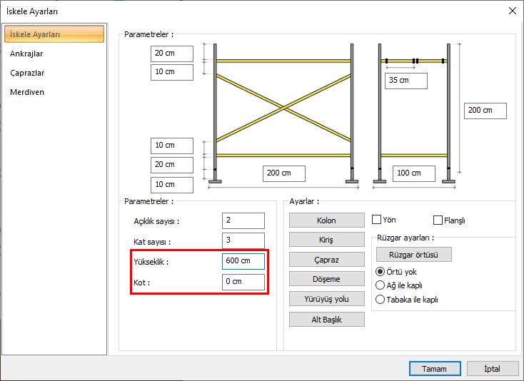 İskele ayarları sekmesinde yükseklik ve kot değerlerini düzenleyin.