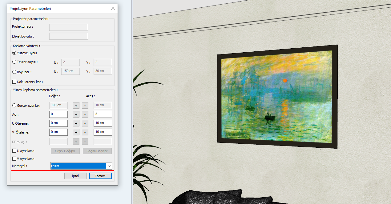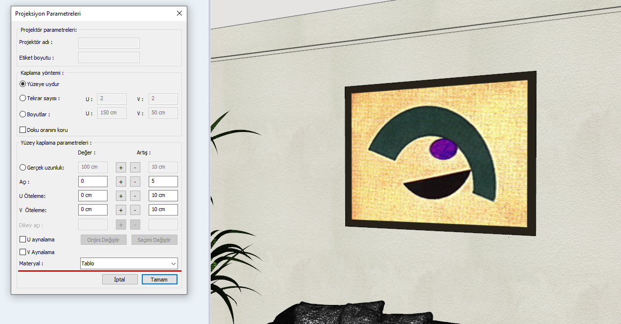 Projeksiyon parametreleri diyaloğundan materyal ayarına ulaşabilirsiniz.