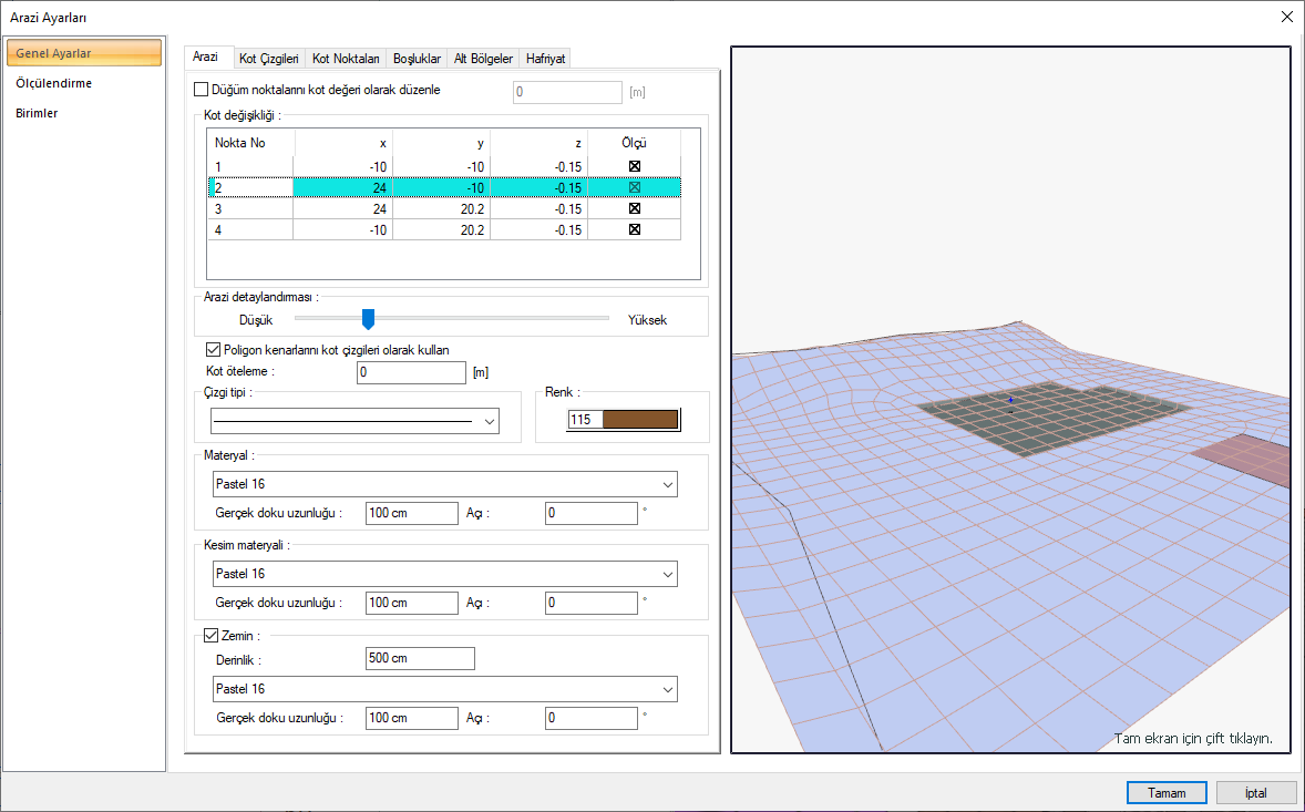 Perspektif ekranda arazinin üzerine çift tıklayın. Arazi ayarları diyaloğu açılacaktır.