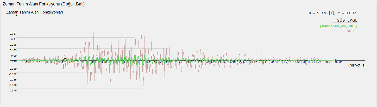 Yukarıdaki resimde görüldüğü üzere ölçeklendirilmiş ve ölçeklendirilmemiş ivme kayıtları ayrı ayrı gösterilmektedir. Aşağıdaki resimde yeşil renk ile gösterilen grafik ivme kaydının ölçeklendirilmemiş halini kırmızı ile gösterilen grafik ise ivme kaydının ölçeklendirilmiş hali görülmektedir.