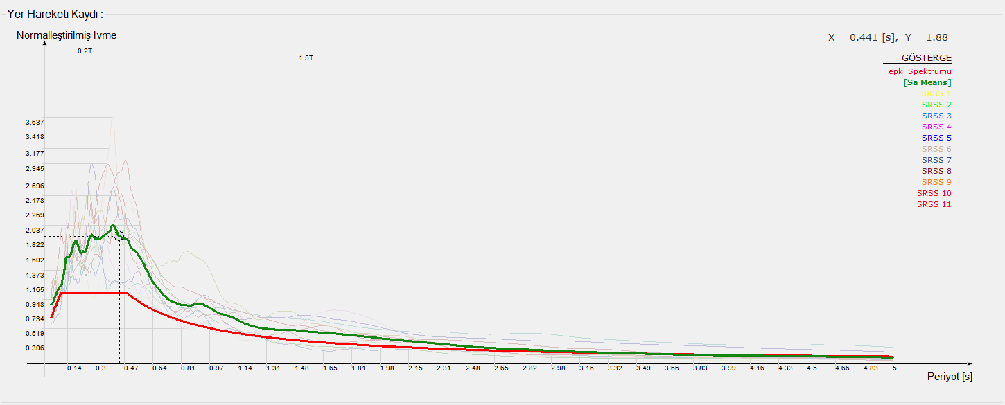 Onbir ivme kaydının spektrumlarının ortalaması ile Yatay Elastik Tasarım Spektrumu 'nun karşılaştırılması aşağıdaki resimde gösterilmiştir. Burada yeşil ile gösterilen grafik ölçeklendirilmiş bileşke yatay spektrumların ortalamasıdır. Kırmızı ile gösterilen grafik de yatay elastik tasarım spektrumudur. 0.2Tp ve 1.5Tp periyotları arasında bu iki grafik karşılaştırılmış ve genlikleri oranının 1.3 'den büyük olduğu görülmüştür.