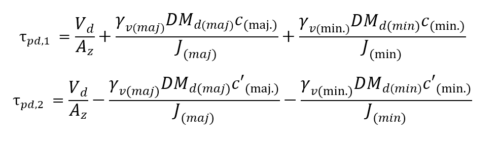 τpd,1 , τpd,2 : Tasarıma esas zımbalama gerilmelerini ifade etmektedir. Eksenel kuvvet ve eğilme momentlerinin etkisi dikkate alınarak döşeme oluşan en büyük ve en küçük zımbalama gerilmeleridir ve aşağıda gösterilen denklemler ile hesaplanmaktadır.