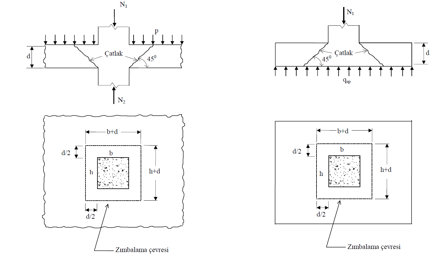 Bütün yükleme kombinasyonlarına göre yapılan zımbalama gerilmelerinin ( τpd,1 , τpd,2 ), mutlak değerce en büyük olan değeri betonun tasarım çekme dayanımı (fctd) değerini aşmaması gerekmektedir.