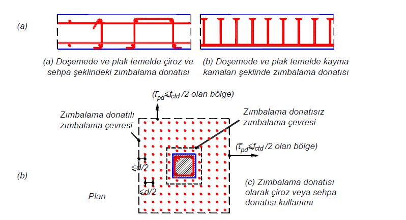 TBDY Madde 7.11.10 'a göre τpd ≤ fctd koşulunun sağlanmadığı ve plak kalınlığının 250 mm 'den büyük olduğu durumlarda zımbalama dayanımı zımbalama donatısı kullanarak arttırabilir.