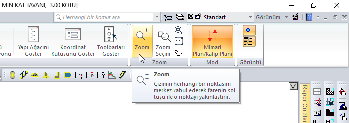 Plan ve 2 boyutlu çizim pencerelerinde yakınlaşmak ve uzaklaşmak için farenin tekerleği dışında Zoom komutu da kullanılır.