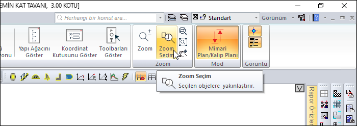 Zoom Seçim komutuyla, plan ve 2 boyutlu çizim pencerelerinde görüntüyü, seçilen obje ya da objelerin tümü ekranda görünecek şekilde yakınlaştırır ya da uzaklaştırır.